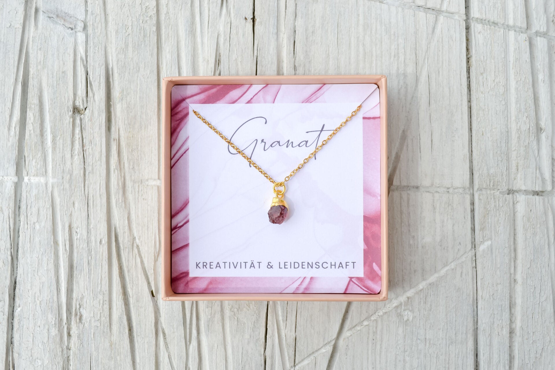 Diese zarte Edelstahl-Halskette ist mit einem wunderschönen Granat-Anhänger versehen, in Edelstahl oder Edelstahl vergoldet. Die Kette ist in 4 verschiedenen Längen erhältlich (siehe Auswahl). Außerdem ist diese Kette ist in vielen verschiedenen Kristall bzw. Farbvarianten erhältlich - durch ihre Zartheit ist sie auch wunderbar geeignet als Layering-Schmuck.