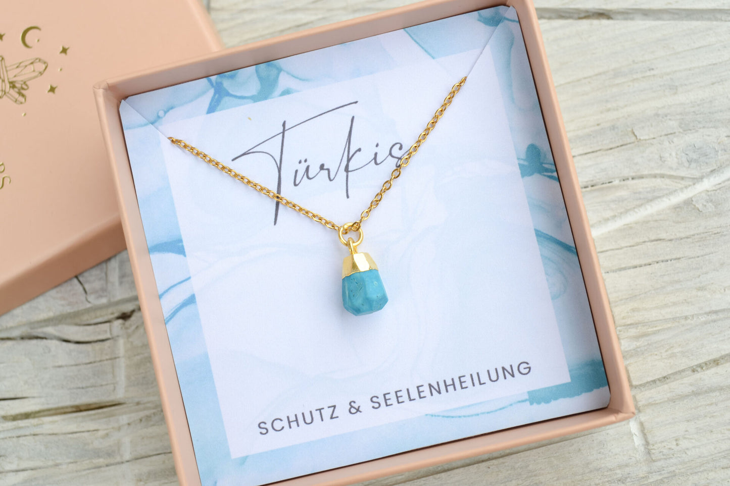 Diese zarte Edelstahl-Halskette ist mit einem wunderschönen Türkis-Anhänger versehen, in Edelstahl oder Edelstahl vergoldet. Die Kette ist in 4 verschiedenen Längen erhältlich (siehe Auswahl). Außerdem ist diese Kette ist in vielen verschiedenen Kristall bzw. Farbvarianten erhältlich - durch ihre Zartheit ist sie auch wunderbar geeignet als Layering-Schmuck.
