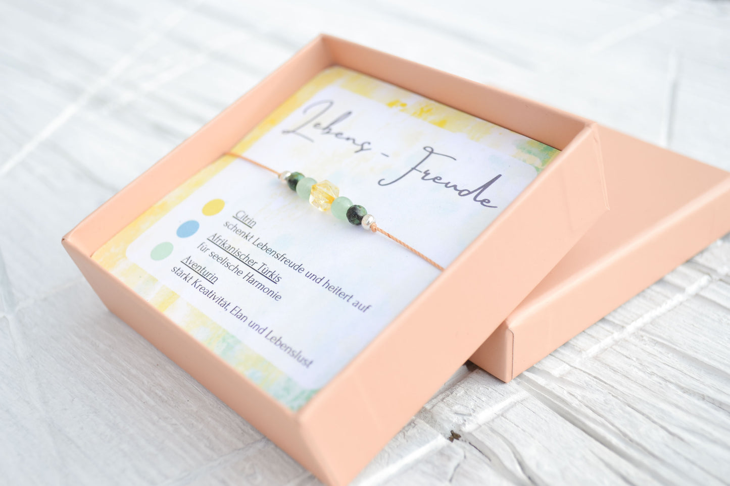 Das Armband ist mit einem Schiebeknoten geknüpft, sodass es längenverstellbar ist und jedem Handgelenk passt. Am Ende des Armbandes befinden sich dann auch nochmal diese kleinen Edelstahlperlen in Gold- oder Silberfarbe.